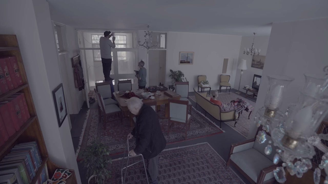 Documentarian Firouzeh Khosrovani lives in America, having left Iran for Italy as an adult. Video artist Morteza Ahmadvand is based in Tehran. Their international collaboration first presents itself as a first-person documentary, but not from the exact perspective of either of the pair. Past Future Continuous unfolds as an edited together montage of moments in which the film’s narrator voice, Maryam, a member of a marginalised group who escaped Iran in 1979 and is now unable to return, observes her aging parents in Tehran, talking about them while viewing them via the eight household cameras, or simply keeping watch over them like some kind of guardian angel looking down from the God’s eye view of the closed circuit camera network she has constructed, Big Brother-like, throughout the white brick compound that is their home. But the film is instead a fiction of sorts. Maryam is a character created by the filmmakers, and her parents are actors, playing out their roles within the architecture of a home that serves as a studio backlot-like set for a stage play set within the confines of a home. The film’s narrative construct acts as a stand-in for the experience that many in Iran have had, of separation and distance, of unbridgeable physical and emotional divides. The Maryam of the film could be Bani Khoshnoudi, or any of the many Iranian filmmakers unable to return to Iran, but more than this, she is an avatar metaphor for anyone anywhere separated from their family, forced to connect with them only through audio and video mediated through semi-connective virtual screens.