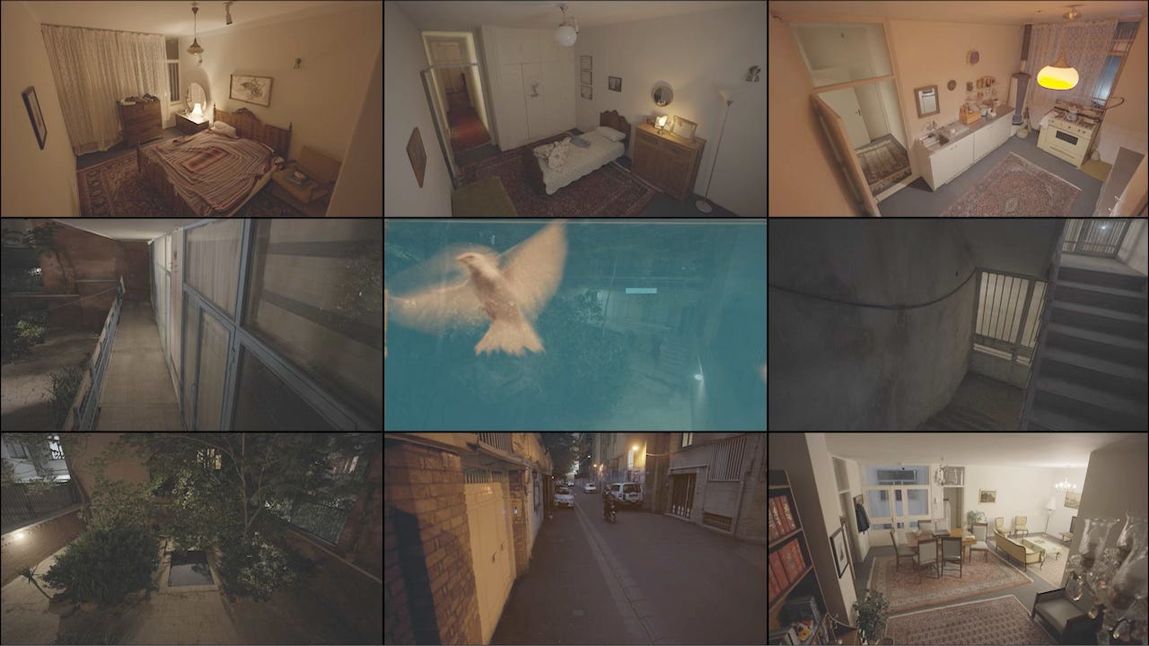 The parents potter around their home, cooking, chatting, watching television, and at one point, dancing, seemingly purely for the amusement of their onlooker. Maryam narrates their experience, describing her memories of the family’s past and her relation to this witnessed present, teasing out details of the state of the nation that has caused her to foster this imperfect connection with her parents living out their last days. Occasionally, archival home movies of unknown providence are interspersed to visualise the described past. One particularly moving sequence staged via the theatre of cross-cutting security cameras details an attempt to arrange international travel, interrupted by illness and a near-death experience, all witnessed distressingly from the camera network mounted high up above. In a less effective moment and a quite an on-the-nose symbolic gesture, Maryam purchases them a parrot in an attempt to break the silence of the home—a bird within a cage within a cage.