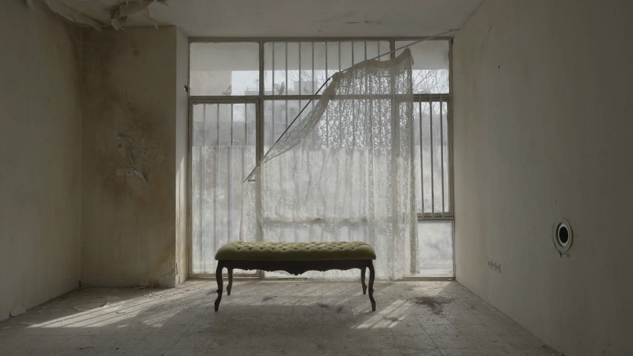 Khoshnoudi’s cousin was imprisoned for her involvement in a militant leftist group and then swiftly disappeared, causing irreparable damage to the family and instigating a silence that became irreversible. Khoshnoudi attempts to revive her cousin’s memory through the minimal traces that remain of her, seen in the film in the form of a few objects: a torn-out photograph, a pair of eyeglasses, and a notebook. Presented to the family by the authorities after the disappearance, these objects came with the implication that they should say nothing, lest they face the same fate. As is suggested by the images of crumbling walls, emptied out rooms, and foreboding skies, one of the key questions of the film is: What does it mean when erasure comes not only from the state but also from a family too hurt and scared to talk openly, favouring instead to bury all memories and suppress the pain? “The family would never speak about it,” says Khoshnoudi. “And my great uncle would never speak again, period.”